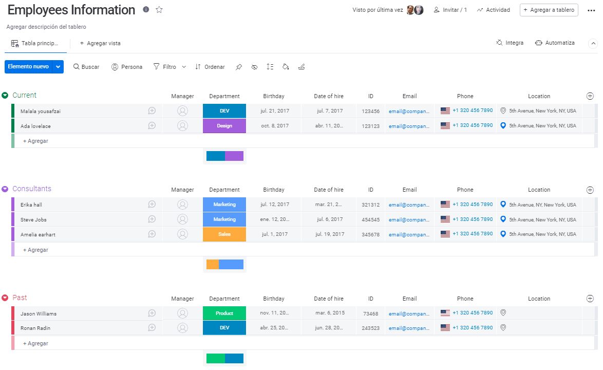 Se pueden personalizar completamente. Cambiar el nombre de las columnas, añadir nuevas columnas con nuevos tipos de datos o modificar los grupos de empleados. En este caso los divide en tres grupos: empleados actuales, consultores y empleados que ya no pertenecen a la empresa. Veamos un ejemplo de personalización de este tablero: