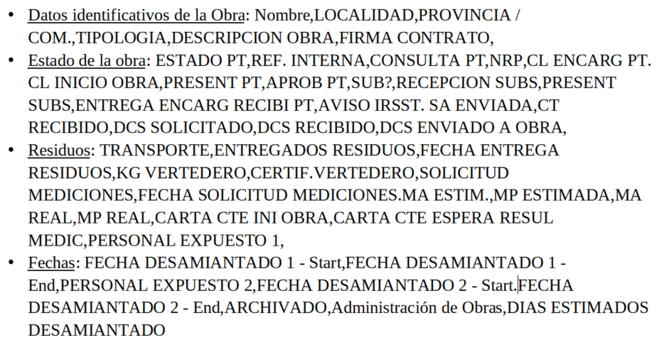 Este tablero también está dotado de automatizaciones para generar avisos en función de la fecha y de alguna columna de tipo «estado». Permite tener controladas en todo momento las obras en las que interviene la retirada de amianto. Además puede generar informes automáticamente con todos los datos de cada obra en caso necesario. Sólo hay que definir una plantilla (parecido al word) con variables referenciadas en ciertas columnas (para identificar la obra, su estado, etc…).