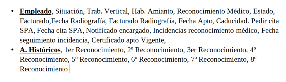 Varias de estas columnas reflejan un estado. Por ejemplo si el operario está habilitado para trabajos con amianto o si tiene certificación para realizar trabajos verticales o incluso si es de oficina. También el tipo de reconocimiento médico y si está en vigor, caducado o tiene próxima la fecha de caducidad: